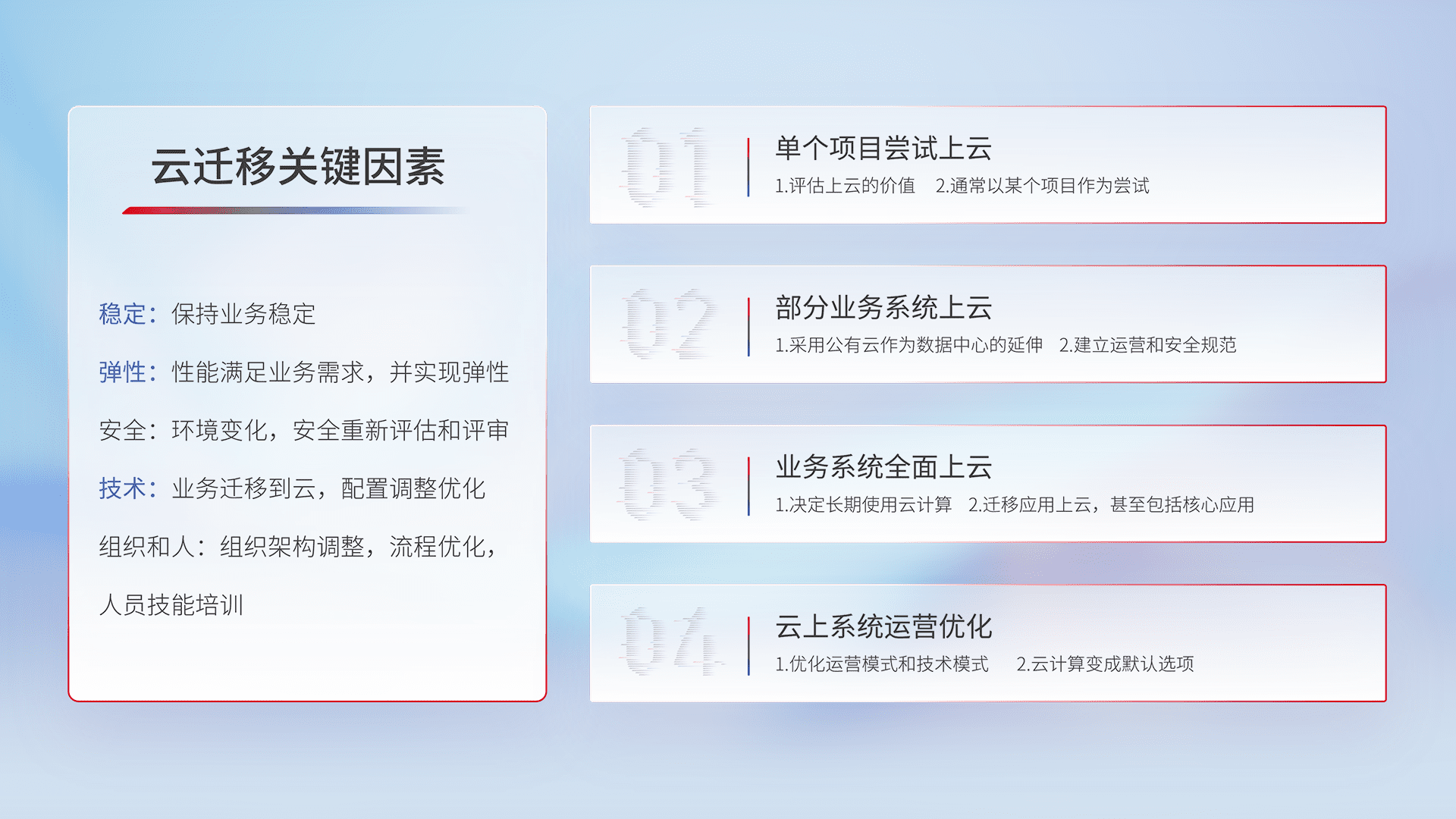 结合实际业务,,,从规划设计、、云平台选型、、云原生改造、、数据迁移、、集成交付,,,,迁移全过程为客户识别最佳上云路径,,做好风险识别管理,,,设计网络架构、、、、身份权限、、、、安全审计合规、、操作审计、、、、日志审计、、、监控告警策略、、、多站点容灾设计等,,,对云上基础设施进行整体规划,,,提升IT治理水平,,以满足弹性、、高可用、、高性能的需求。。。