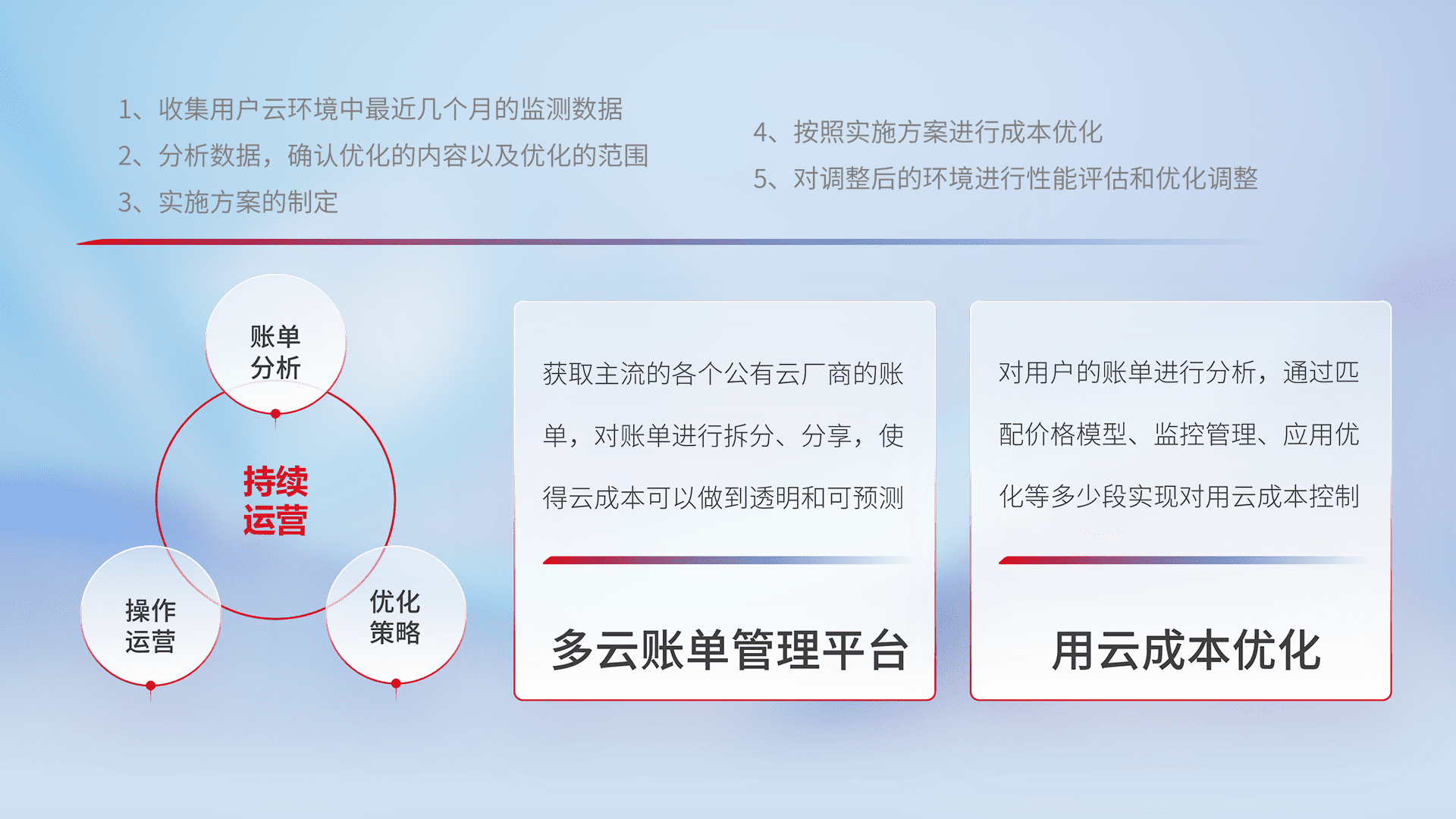 通过多云纳管,,以统一的资源数据模型把客户的云资源进行抽象和封装,,,进而实现对多云资源的统一操作,,,保障云资源管理的可靠性、、、、稳定性与可用性。。。量身定制化运维内容,,,,配置、、、开发运维、、、、补丁管理、、备份、、、监控、、、、认证和访问管理、、审计和日常巡检等,,,保障在用云过程中的可靠度,,稳定度以及高可用率。。。。